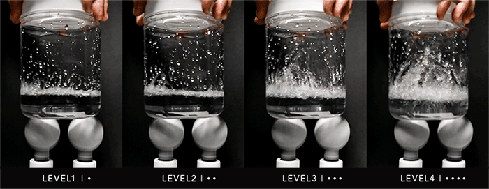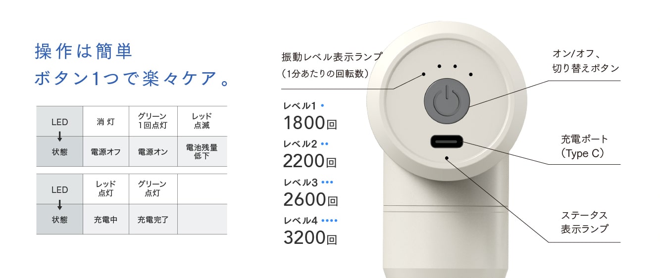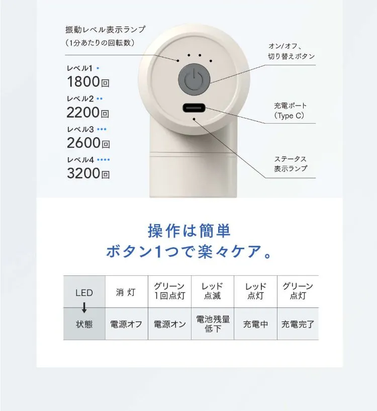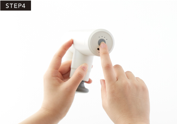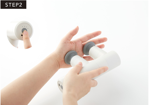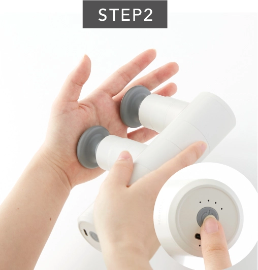 電源ボタンを2秒間以上押して、本体の電源を入れます。ボタンを押すごとに振動レベルが1ずつ上がるので、手のひらで確認しながら調整してください。 -