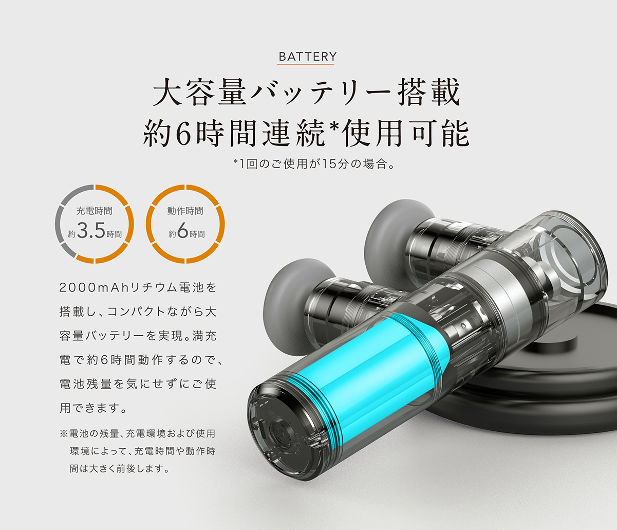 2000mAhリチウム電池を搭載し、コンパクトながら大容量バッテリーを実現。