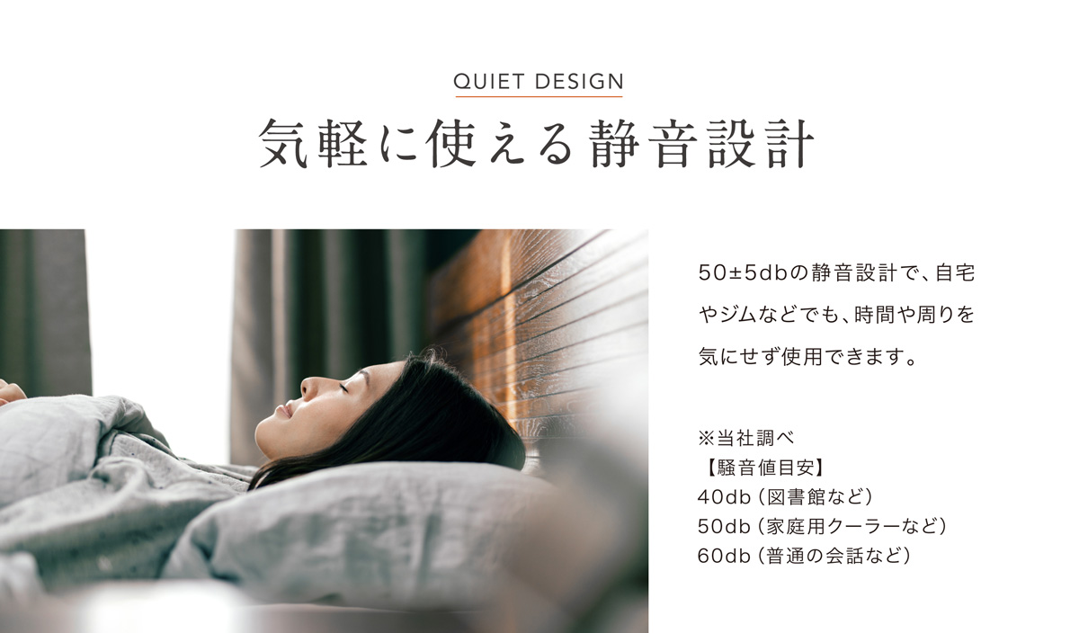 50±5dbの静音設計で、自宅やジムなどでも、時間や周りを気にせず使用できます。